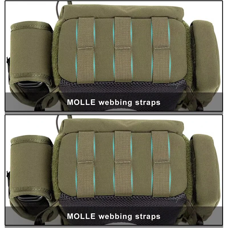Portable Multi Pockets: 1 main large compartment with 2 little mesh storage, 1 detachment rangefinder pouch and side pocket,1 front phone pocket,1 layer mesh space,1 rain cover pocket;The bottom of the binocular harness chest pack is equipped with molle straps.